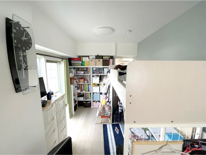 洋室の間仕切り壁を撤去し、娘さんの部屋と子ども部屋を連続したスペースに。娘さんの部屋は玄関に、子ども部屋はキッチン・リビングに隣接。