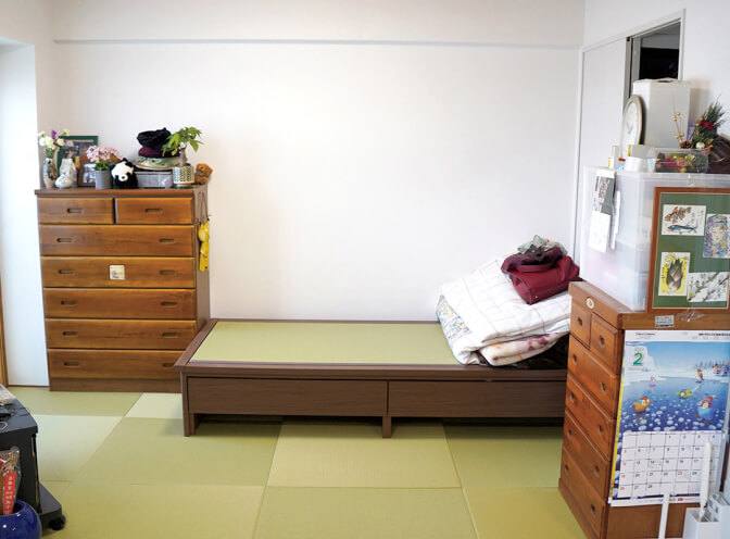 リビングの向こう側は寝室に。カーテンで仕切って広さを確保しました。将来介護が必要になったときにも動線が良く、コミュニケーションを取りやすいこともメリットです。